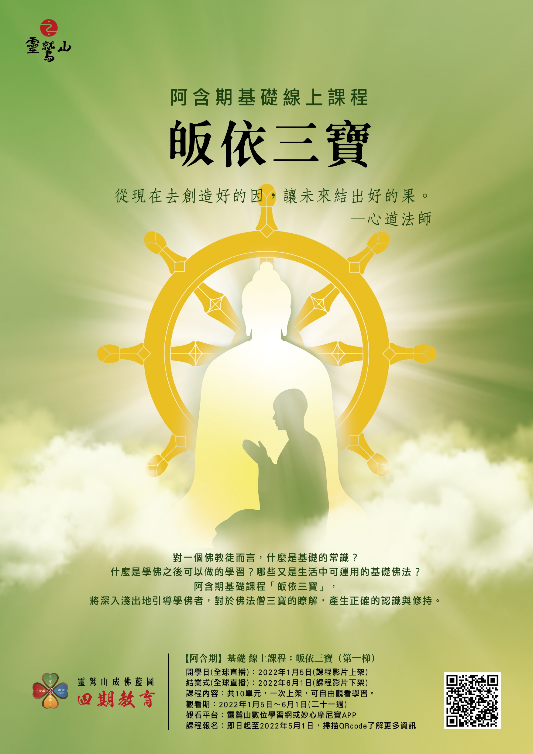 | 從皈依三寶、學習佛法開始,從現在去創造好的因,讓未來結出好的果,長遠的離苦得樂。 ~心道法師 法語 ■課程簡介: 什麼是皈依?皈依誰?皈依後要做什麼?佛門有什麼規矩?對於一個佛教徒而言,什麼是學佛之後可以做的學習? 【阿含期】基礎課程《皈依三寶》學佛入門的指南針。 從認識「皈依」的意義,之後介紹皈依的對象「禮敬三寶-佛寶」,講述佛的名號等,令學員生起信心從而學習;「禮敬三寶-法寶」,了解法的功德與修學法寶的方法等;「禮敬三寶-僧寶」當中,有僧伽的使命、功德、與恭敬之方;還有學習生活上的「佛門行儀」教授,從行住坐臥四威儀、合掌、禮拜、拿香、入佛殿…等,瞭解每個動作的意涵與背後義理的精神所在。 【阿含期】基礎課程《皈依三寶》線上課程,共10單元,每單元又為2-5小節 |