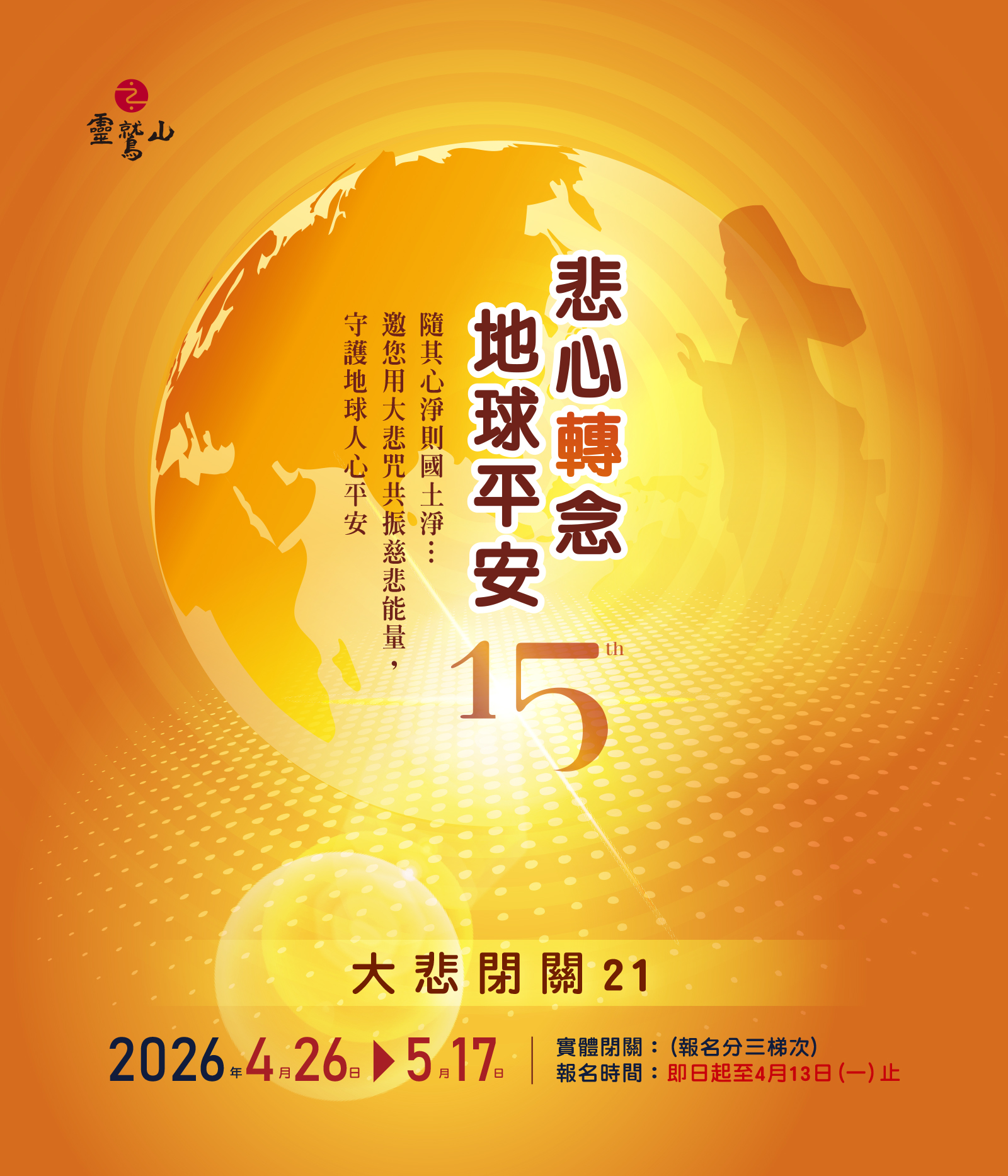 當世界動盪、災變頻仍,人心也更需要一個安定的依靠。 觀世音菩薩以「聞聲 救苦」的慈悲行願,提醒我們:唯有回到內心、培養悲心,才能安住自己,也 護念萬物。 靈鷲山開山和尚心道法師,自幼飽受戰亂,十五歲初聞觀音菩薩聖號,發願一 生奉行觀音行願,修持弘揚〈大悲咒〉。心道法師有感天災人禍不斷,人心惶惶 不安,2012年起,年年舉辦21天大悲閉關,匯聚全球善念,持誦大悲咒,回 向地球平安! 2026 年大悲閉關,以「悲心轉念・地球平安」為核心精神。透過專注而穩定的 共修修持,將一聲聲大悲咒音,化為安定身心的力量,也轉為護念地球、回向 世界的祝福。這不僅是一段個人的修行歷程,更是一場以慈悲心回應眾生苦 難、以清淨願力守護地球的行動。 誠摯邀請您把握這份難得的因緣,走入「大悲閉關」 ,讓每一聲咒音、每一份 悲心,成為安定人心、護念世界的力量,與眾同行,為自己,也為地球發願。