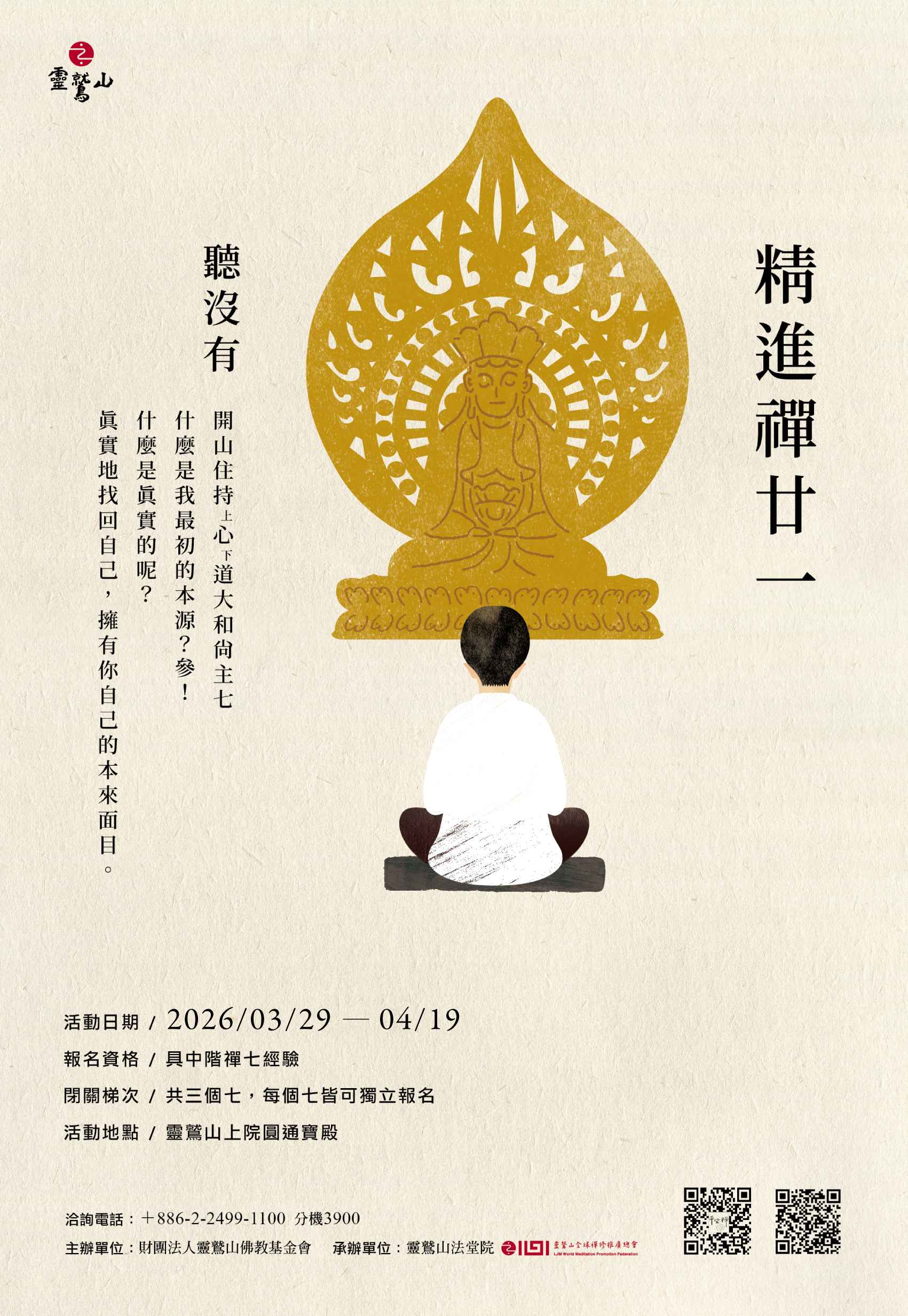 具有一次以上靈鷲山禪七經驗,熟習平安禪法門。每梯限額100名